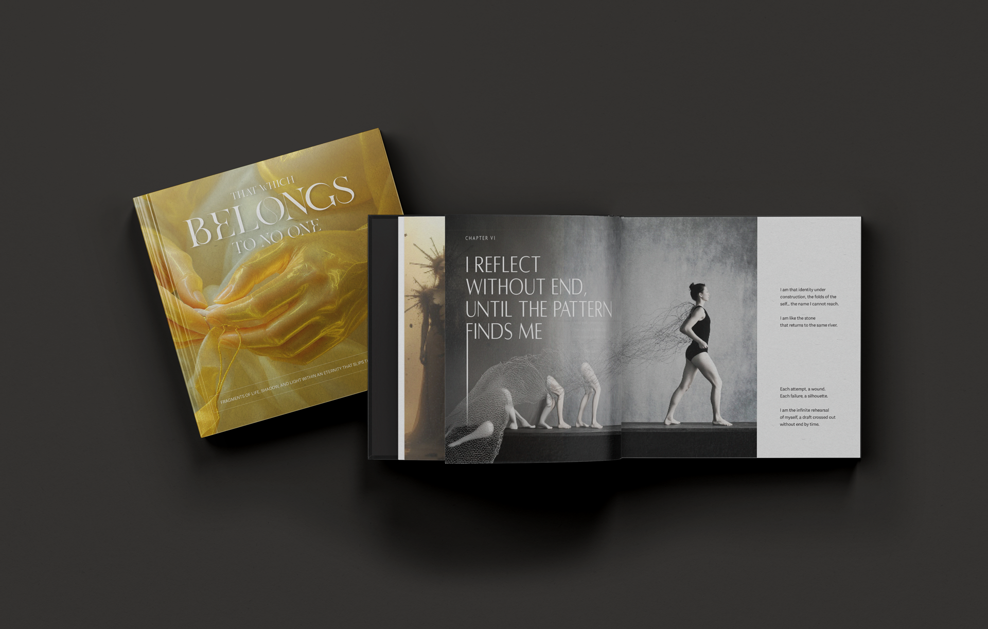 What Which Belongs to No One is a speculative book that questions the idea of ownership in creative work. Through a combination of text, image, and conceptual framing, the project explores what happens when authorship is no longer singular. In a world influenced by artificial intelligence, collective inputs, and distributed systems, creation becomes less about control and more about interaction.